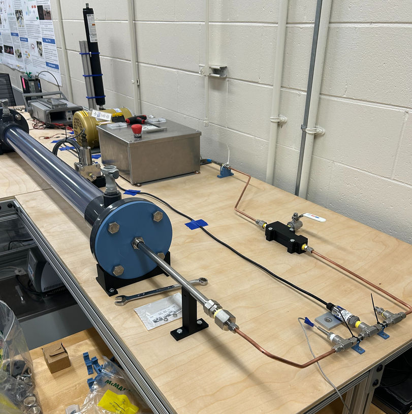 We developed a test stand to measure the heat transfer coefficient. This included a corrugated aluminum pipe that would flow high-pressure and high-temperature carbon dioxide through a bath of water. We would measure the temperature change of the water from a calculated mass flow rate over time to determine the coefficient.
